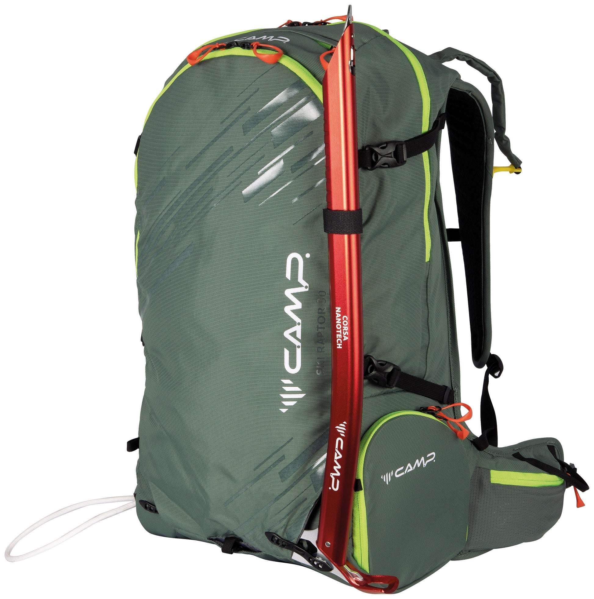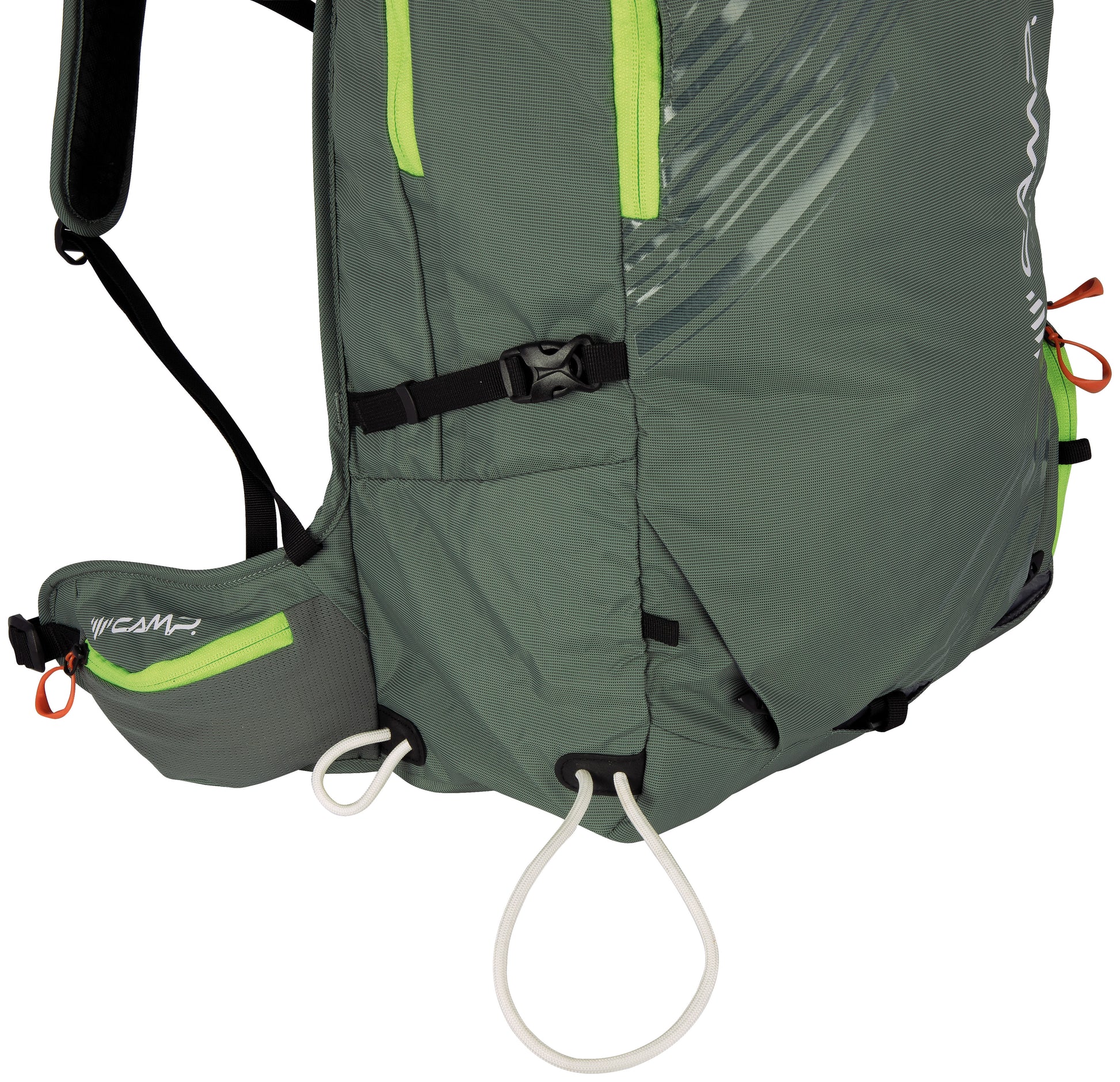 - Scomparto ramponi a tunnel con apertura laterale con zip, accessibile senza rimuovere lo zaino e collegabile allo scomparto principale grazie ad una zip interna